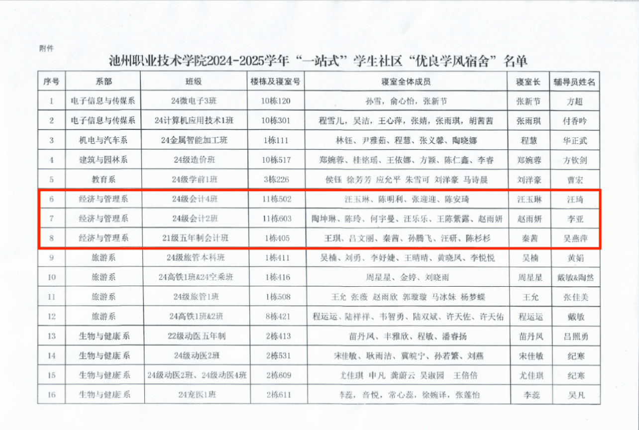 根据《池州职业技术学院关于进一步加强和改进学生学风建设的实施方案》(池职院〔2025〕55号)文件精神,系全体师生积极响应学校号召,通过组织各种形式的宣传教育活动,营造了良好的宿舍学习文化氛围。在过去的一年里,从各类型活动的举办,从宿舍帮扶到安全教育的普及,每一步都凝聚着师生们的心血与汗水。