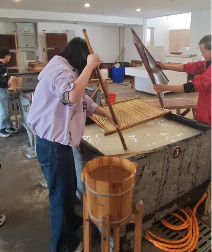在宣纸体验区,女职工们兴致勃勃地参与宣纸制作体验,亲手尝试捞纸、晒纸等简单工序,在动手实践中真切感受宣纸制作的艰辛与乐趣,进一步加深了对传统非遗文化的理解与热爱。活动过程中,大家相互帮助、彼此配合,欢声笑语不断,充分展现了经管系女职工团结协作、积极向上的良好精神风貌。